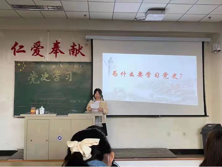 随后,丛佳汇同学与大家分享了对于学习党史必要性的理解。她以习近平总书记在中央党校建校80周年庆祝大会上指出的“学史可以看成败、鉴得失、知兴替”开篇,进而通过自己在党史学习过程中的体会说明只有真正了解过去才能正确认识现在,正确认识现在才能科学把握未来,并号召大家积极进行党史学习。