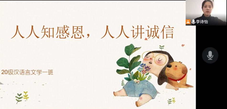 诚信和感恩是中华民族的传统美德,也是社会主义核心价值观的重要内容,更是新时代新青年立身为人、成长成才的必备品质。为增强当代老员工的责任感,培育同学们的感恩之心以及报国之情,20级汉语言文学一班于5月4日通过腾讯会议开展“人人知感恩,人人讲诚信”主题班会,班级全体共29人参加本次会议。
