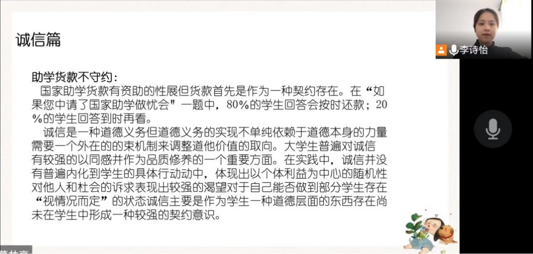 会议伊始,主持人李诗怡为大家普及了金融相关知识,提醒同学们要时刻注意并提高征信意识、法律意识和风险意识,强调诚信和感恩在当今时代的重要性,并列举了发生在我们身边的不诚信的事例,如考试作弊、助学贷款不守约等。希望大家形成契约意识、诚信意识,时刻把诚信放在心中。