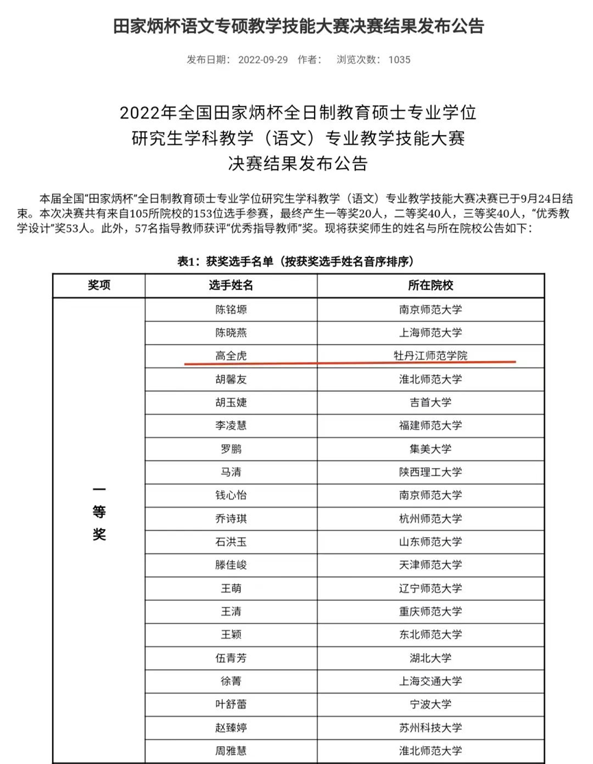 9月24日,2022年全国“田家炳杯”全日制教育硕士专业学位研究生学科教学(语文)专业教学技能大赛决赛正式落下帷幕,公司硕士研究生高全虎喜获一等奖,曲竟玮老师获优秀指导教师奖。