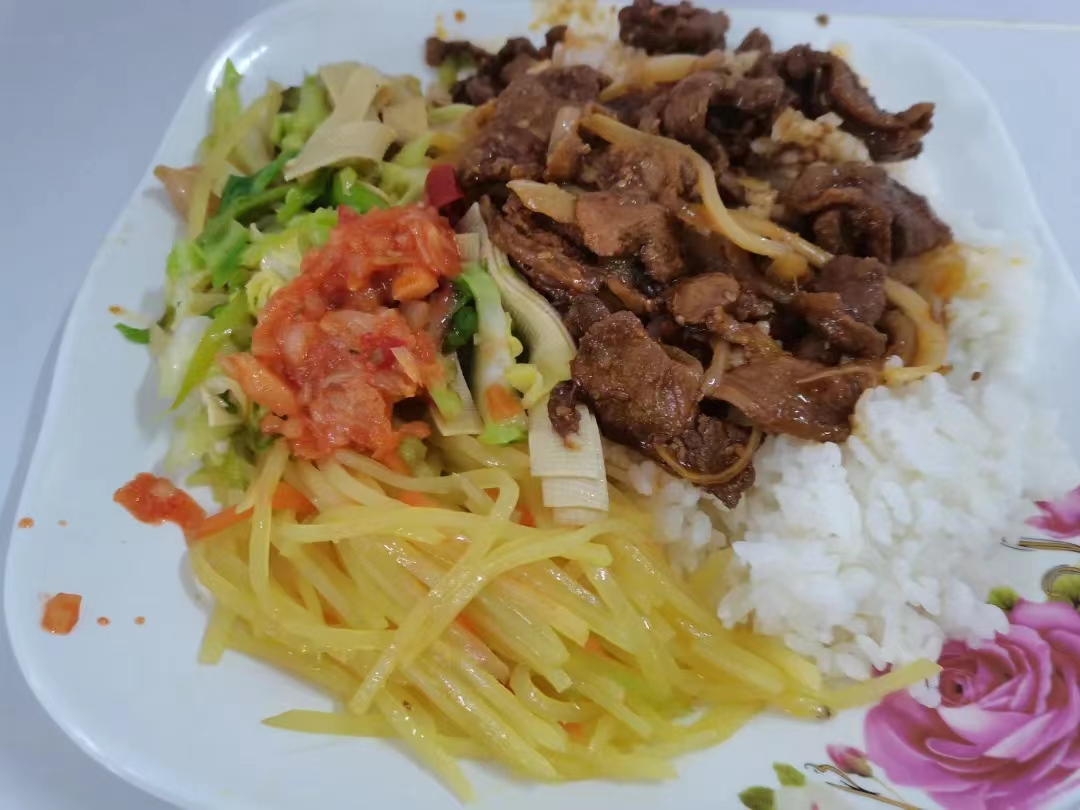 如果你想体验烧烤风味,烤盘饭一定是你的不二选择,每一口配菜都包裹着料汁和孜然,入口咸香,多种配菜,也很适合荤素搭配。