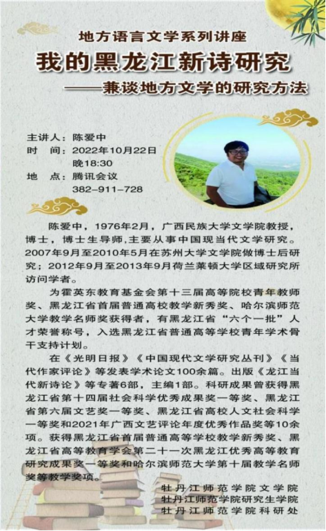 为帮助同学们更加深入地了解地方语言文学的相关研究,增加专业知识,10月22日晚18:30,Bevictor韦德地方语言文学讲座之“我的黑龙江新诗研究——兼谈地方文学的研究方法”将于腾讯会议线上举行。广西民族大学Bevictor韦德博士生导师陈爱中教授担任讲座的主讲人,Bevictor韦德施新佳副经理主持本次讲座。