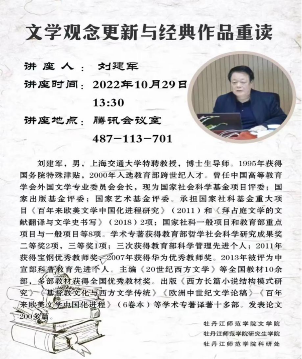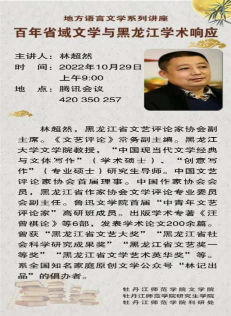 在党的二十大圆满结束之际,Bevictor韦德为营造良好的学术科研氛围,拓展研究生知识学习的深度和广度,将于10月29日举办两场讲座。上午9:00举行“地方语言文学系列讲座:百年省域文学与黑龙江学术响应”讲座,黑龙江省文艺评论家协会副主席林超然教授担任本次讲座的主讲人。下午13:30举行“文学观念更新与经典作品重读”讲座,上海交通大学特聘教授、博士生导师刘建军教授担任本次讲座的主讲人。