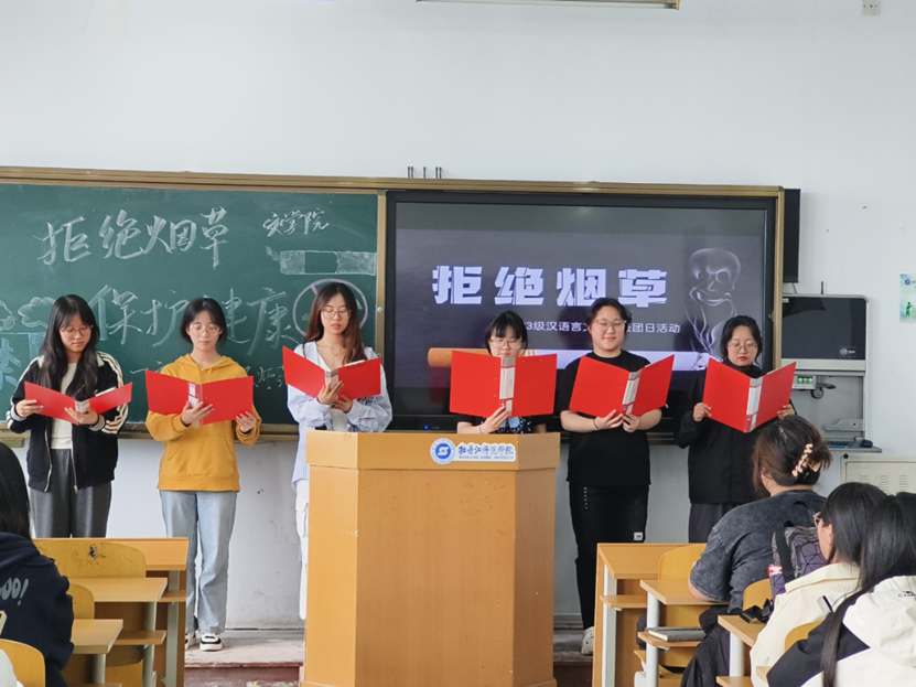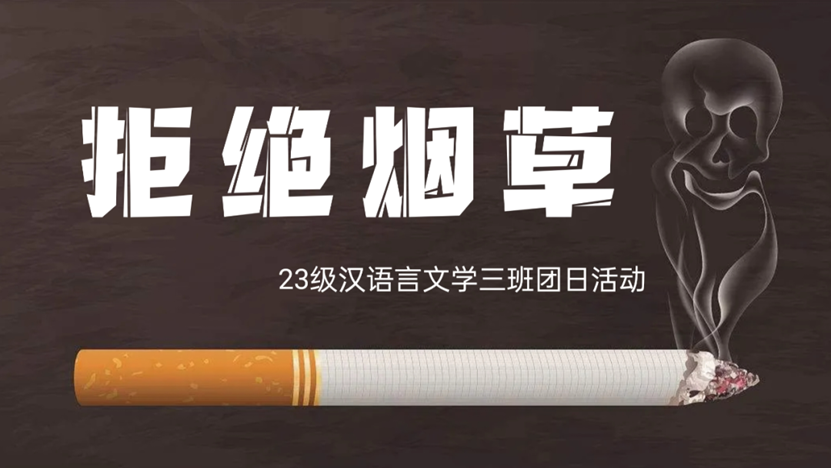 为响应世界无烟日的到来、增强同学们的禁烟意识,营造一个健康、清洁、无烟的校园环境,2023级汉语言文学三班开展团活,使同学们对世界无烟日有了更多的了解,大家都表示会拒绝抽烟,也会劝导周围的人不要抽烟,为世界无烟做出自己的贡献。